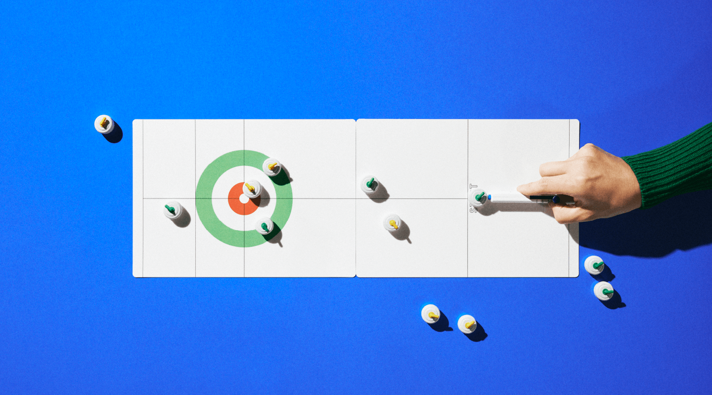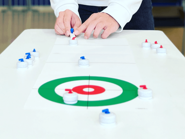 本格的なカーリングのルールで行うボードゲーム競技。消しゴム製の駒を6段変速ブースターペンで飛ばして得点を競い合います。